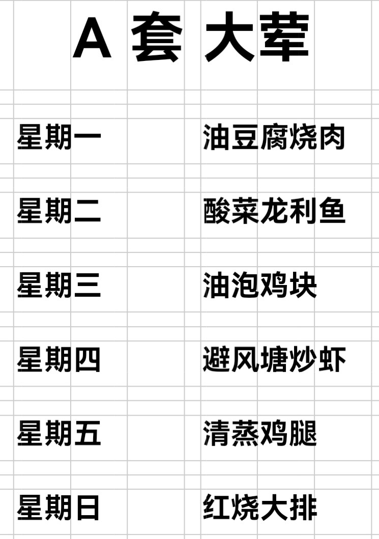 | 日期 | 菜品名称 | 菜品类别 | 菜品食材 | |||