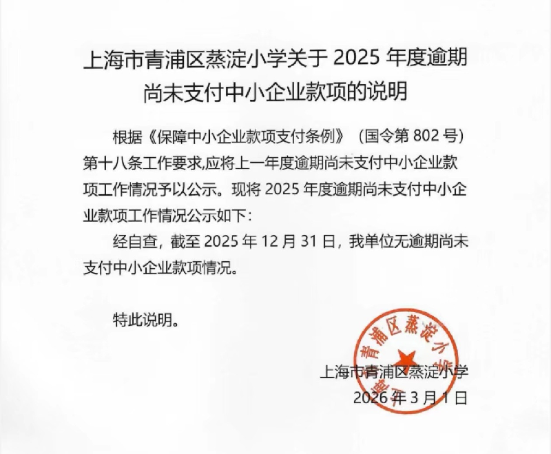 上海市青浦区蒸淀小学关于2025年度逾期尚未支付中小企业款项的说明