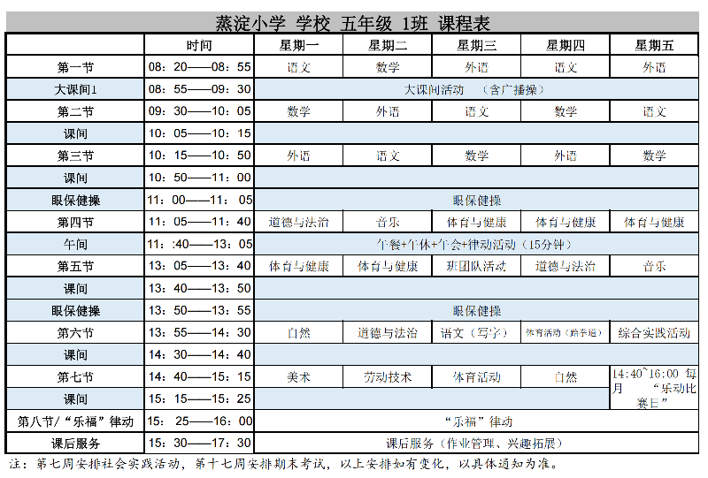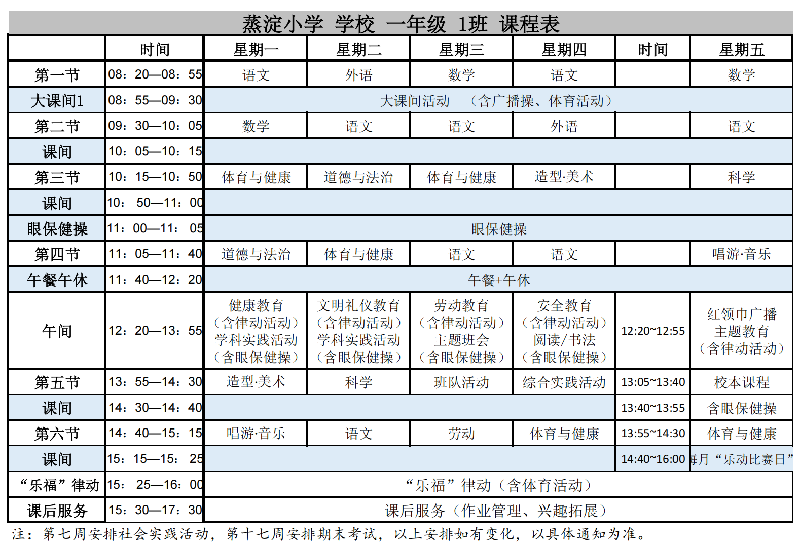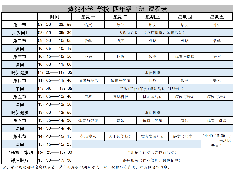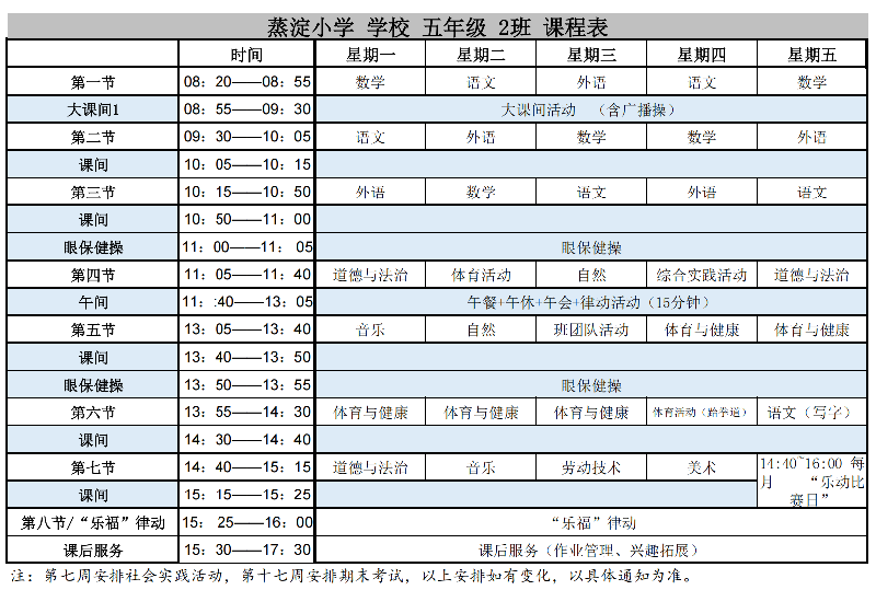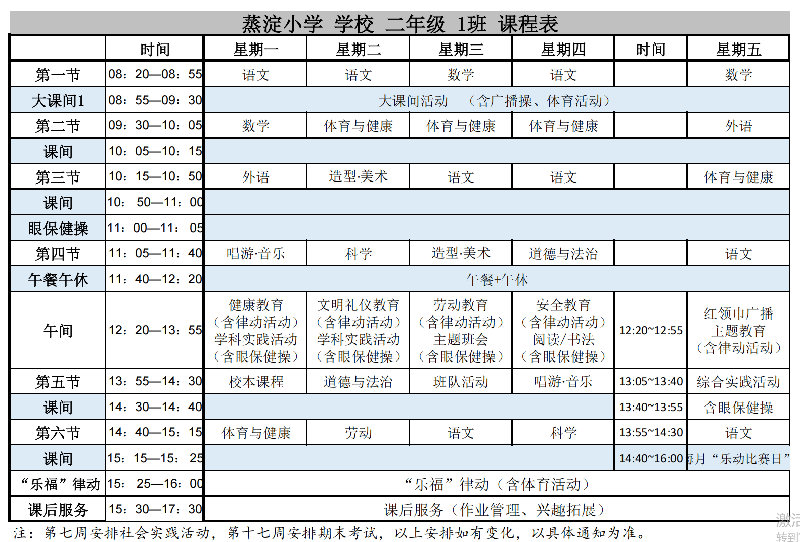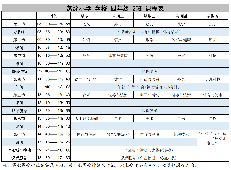 蒸淀小学2025学年第二学期晒课表